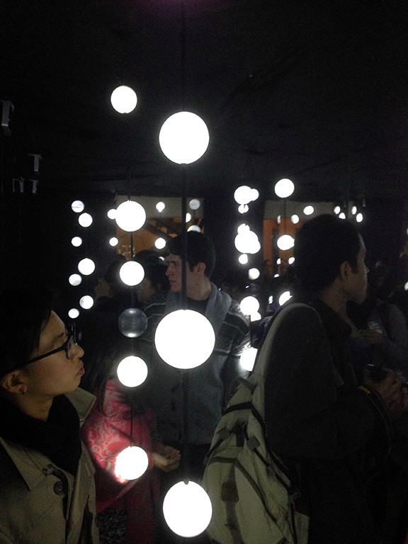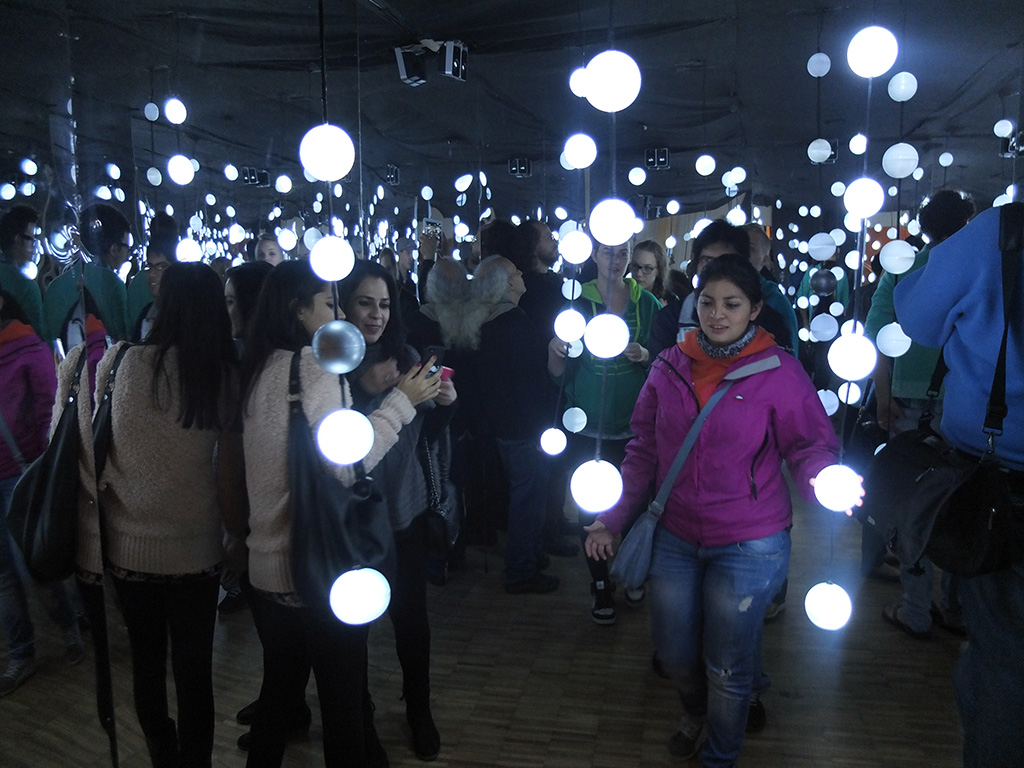 Upon entering the space, one is faced with an infinite reflection of lights that create an endless spectrum of white glowing balls.