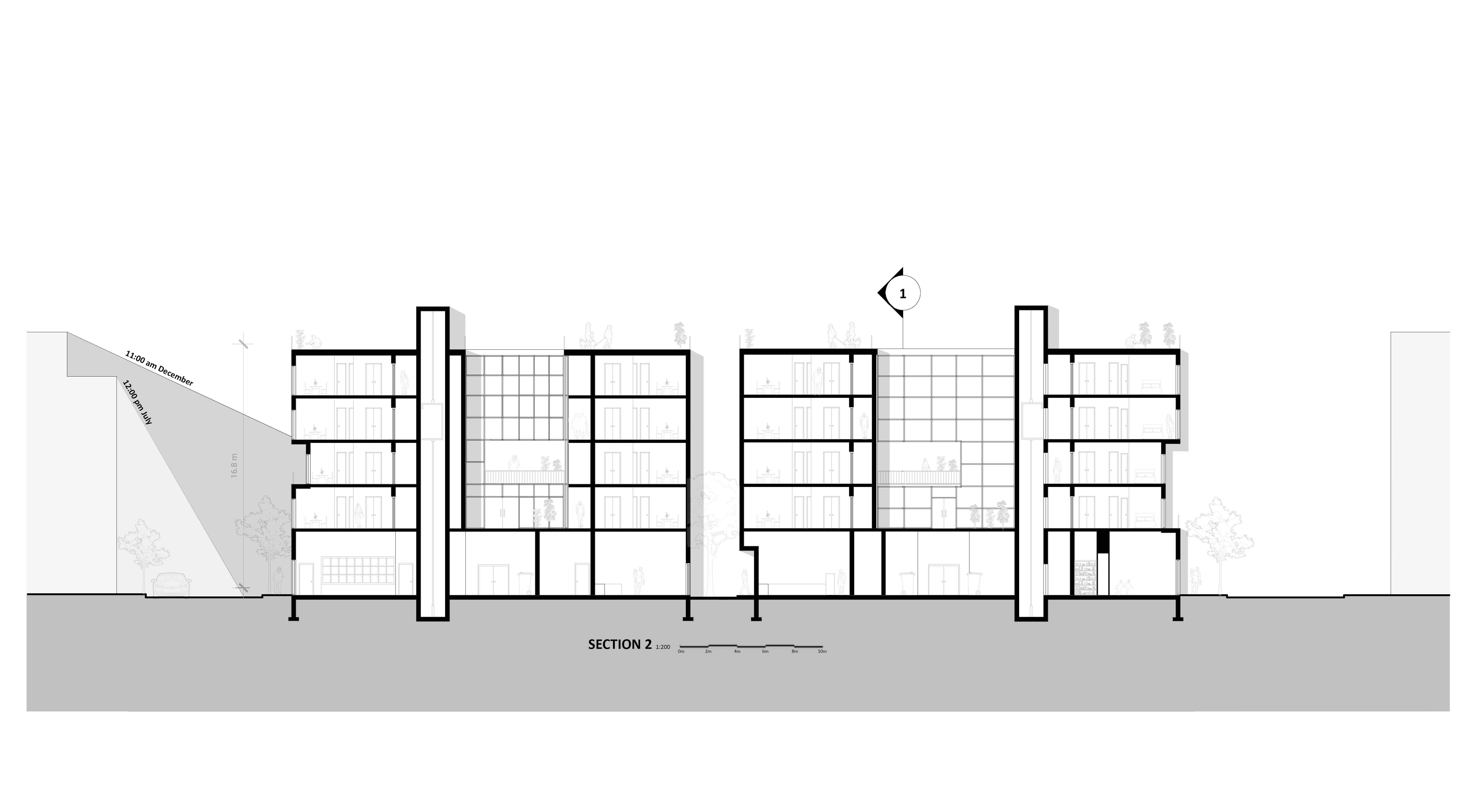 Additionally the residential complex incorporates plenty of other open spaces such as communal courtyards, terraces, a café, gardens, an urban farm, and other exterior spaces that foster community interaction and connectivity. Furthermore, it offers a visual context that unveils the surrounding built environment, encompassing the adjacent park and the neighbouring structures.