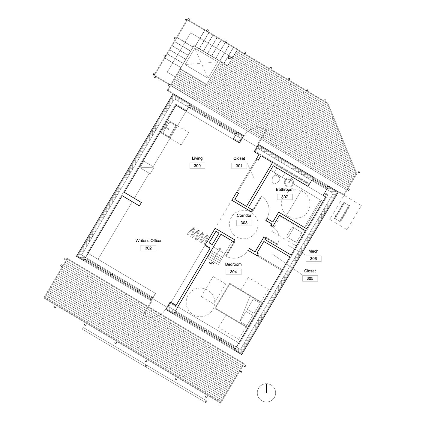 The renovation includes two major design moves: a third floor addition and freestanding scaffold decks in the front and back of the building. The third floor addition incorporates a wide variety of sustainable features including solar panels, natural cross-ventilation, water harvesting, and diffuse daylighting with no glare. It is also a space that improves the overall social sustainability by being completely barrier free and family friendly. Since the lower floors are limiting in terms of mobility, it was imperative to include a wider variety of people as writers are not limited to able-bodied people with minimal family obligations.