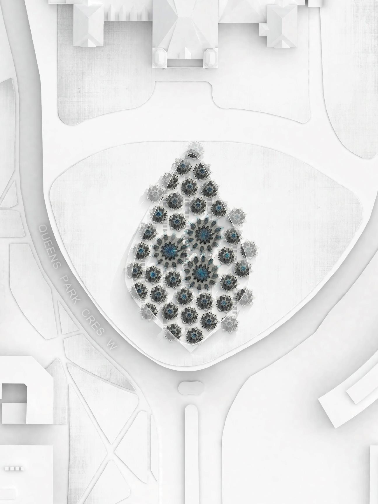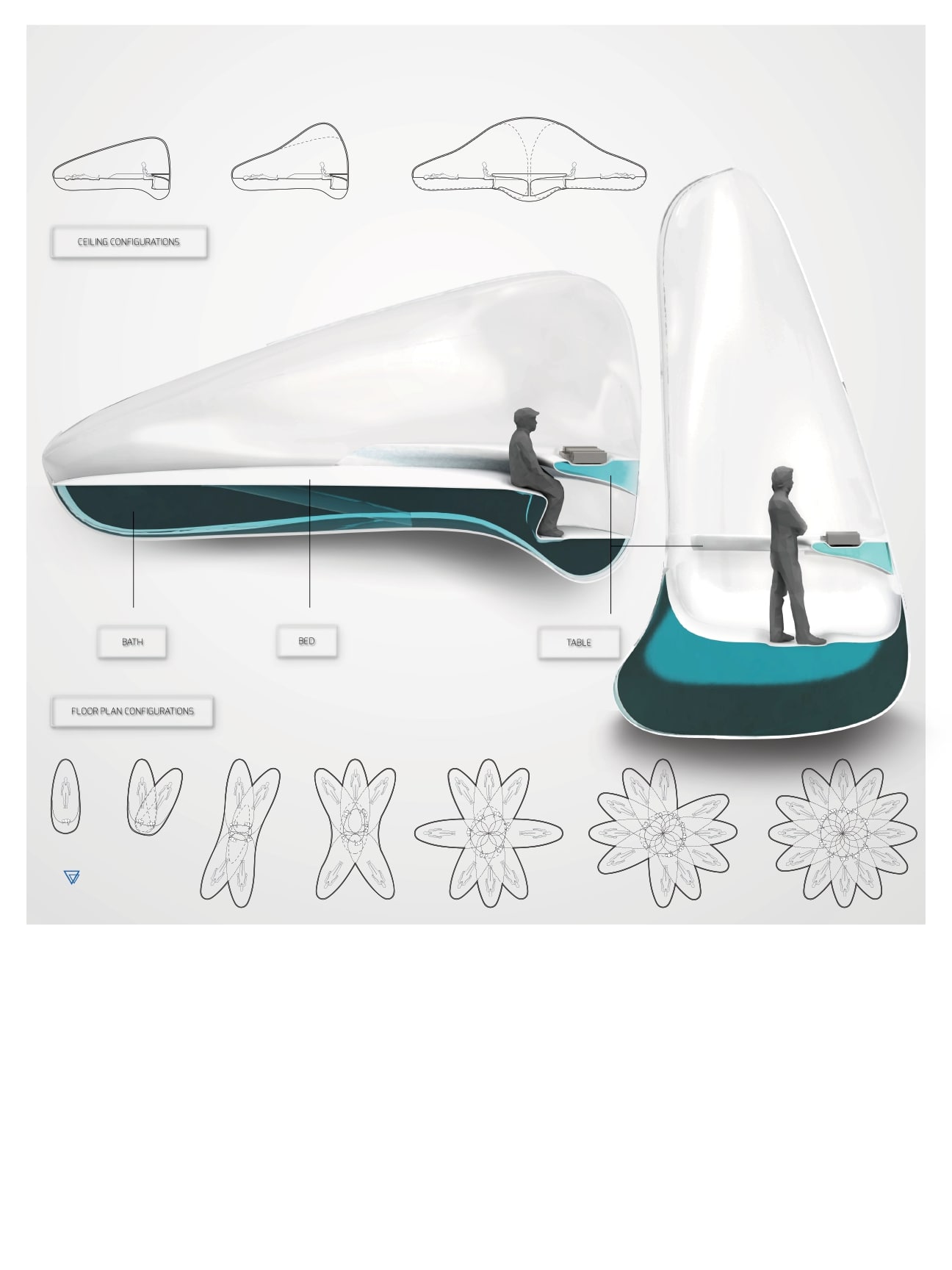 In a rentist future of hierarchy and abundance, the elite own patented technologies and sell products targeting people’s desires to become more productive and efficient without acquiring more. Unknowingly, these devices easily sacrifice privacy rights to these companies for surveillance and data-mining. As technology advances, how will these issues affect the built world? The transparent and inflatable Work-Live Pod offers an accepted form of living that fits within the Creativity Kit. Devoid of traditional furniture, the pods are lined with a material that moulds under the the pressure of water, allowing flexibility for, work, eat, and sleep. Drawing upon the efficient system of cell multiplication, the individual pod units can come together, with its displaced volumes creating larger collaborative spaces. The Pod Vessel is a functional structure that provides the crucial resource and infrastructure for pod-inflation while monitoring the work that is produced.