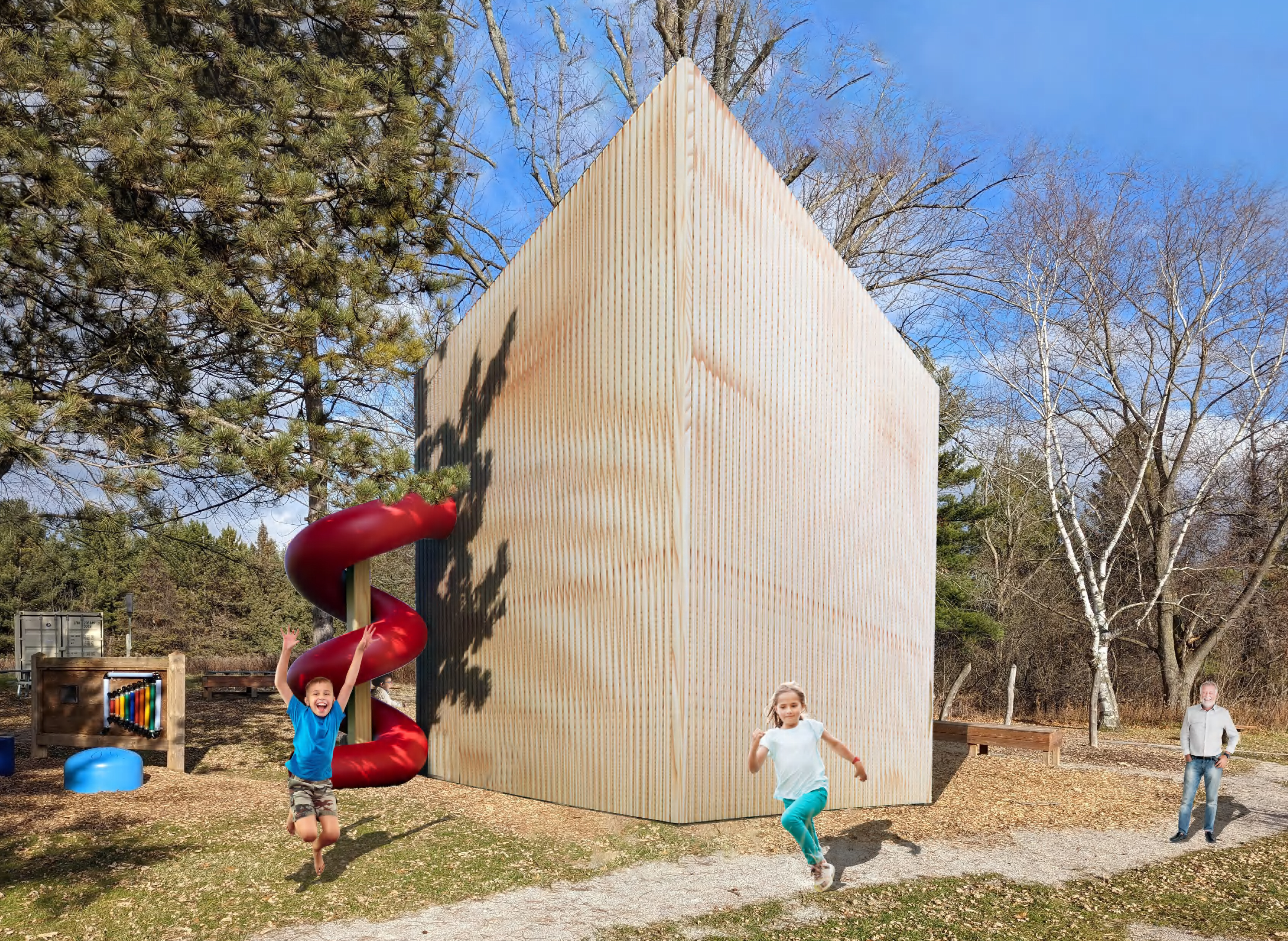 Scanlon Adventure House is located at the underutilized Discovery Play Garden at Scanlon Creek Conservation Area. Adventure house seeks to provide a space for children to ex- plore and challenge their limits by presenting multiple ob- stacles for them to overcome. The crude construction of Ad- venture House symbolically represents the foundations of the understanding ones self through creative play and imagina- tion whilst the form of the architecture is representative of the beautiful simplicity of life as a child. The form intentionally does not enforce its own image onto the children but rather acts as a canvas for their imaginations to run wild as they engage with the structure. Adventure house responds to its immediate context by gently gesturing away from the tree behind Adven- ture House whilst its construction is inspired by established structures on site, the Mud Kitchen and a gathering pavilion.