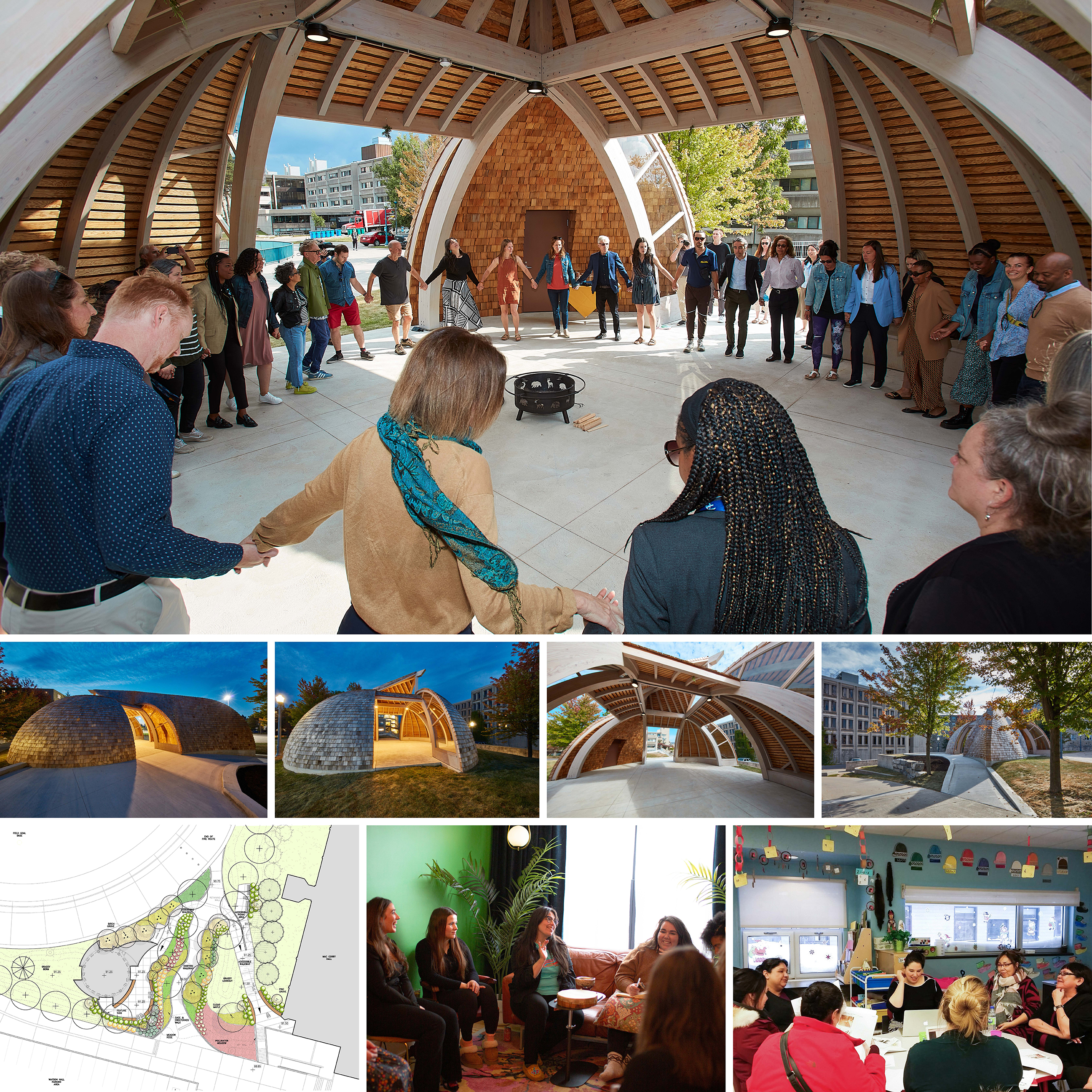 Designed collaboratively with Indigenous Elders, faculty, students, and advisors, this outdoor-integrated learning space is useable year-round, with a central fire and lighting. The space opens to the four cardinal directions and shelters users from rainy weather typical during the academic schedule. The curved glulam frame and cedar cladding over bent ribs celebrates the warmth and flexibility of wood, while daylight from above connects the realms of sky and earth.