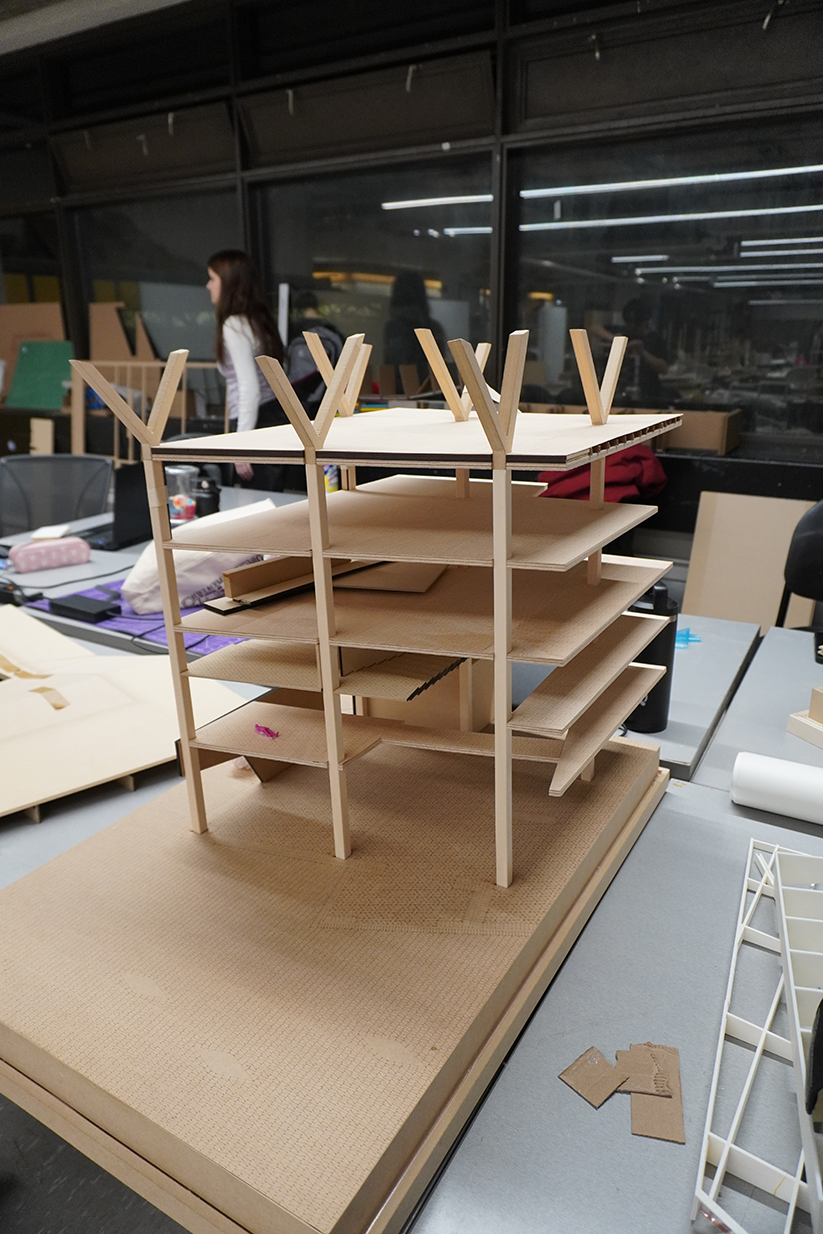 The model depicts how the building opens itself to the street, in order to allow public and private programming to coexist, rather than fight each other. This notion of porosity extends into the upper levels, through the expression of a perforated metal facade, providing shading as well as breaking the building’s form down into a series of masses. As visitors move into the building, they are immediately met with a large social space, and a grand staircase inviting them to ascend and explore the building. Once they reach the final floor, the culmination of the spatial journey, they are rewarded with a beautiful open space, covered in an angled CLT roof, and flooded with natural light. At this point the visitors have reached the pinnacle of the new Architecture Building, and are invited to look over the campus and city.