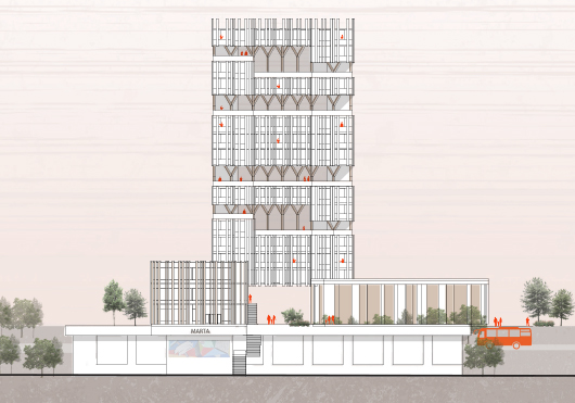 The concept of this building is based on the rich history of the city. Being the city that rose from the ashes after the Civil War, and being a center of the human rights movement in 1960s, the building has to talk to the city’s rich past, connect to the current values and show flexibility. The purpose of this multi-use building is to create a space made for everyone, connecting the outdoors with the indoors while connecting with the art community of Atlanta. The timber construction works great with the concept, because like Atlanta, the wood is strong but flexible. Additionally, wood brings nature inside and creates a warm and inviting atmosphere, while projecting strength. Consequently, it is an ideal material for this project. The project intertwines with the communities core philosophies and help to provide a space to continue inspiring and educating the community as a whole. This urban habitat atop a transportation hub contains elements of Atlanta’s diverse arts while bringing the community together. It is an equitable living space open to both visitors and locals equally. The intention of the project is to be inviting and inclusive, create an atmosphere of warmth, meanwhile, project strength and dominance due to its rich past.