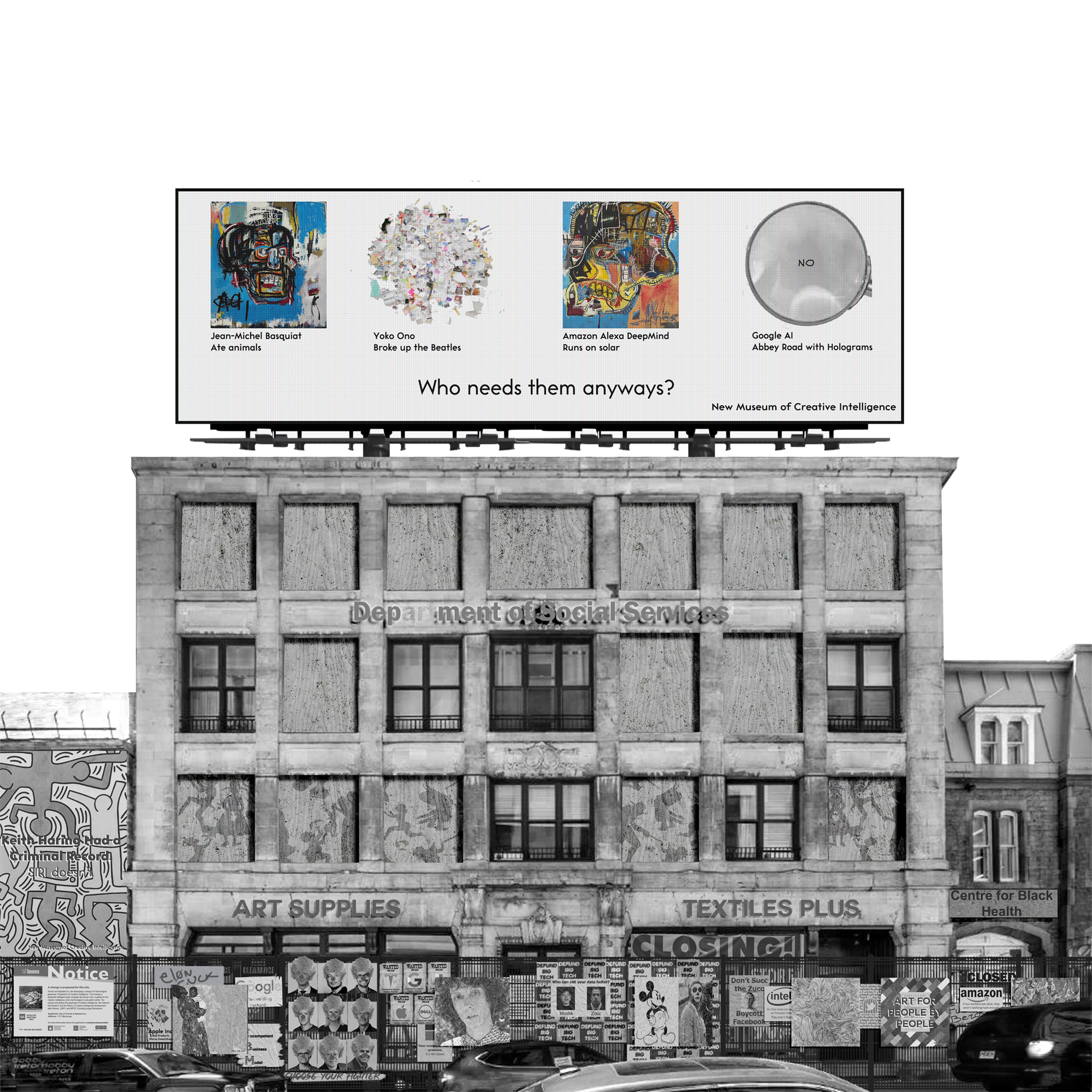 After decades and centuries of systematic oppression, after their voices remain unheard by capitalist and government institutions, Marginalised communities boycott and stop contributing to Mainstream and Pop culture. Mass commodified and consumed culture becomes stale quick. Instead of reinvesting into marginalized communities or re-evaluating the current hierarchical system, Big Tech companies propose the use of their patented Artificial Intelligences to become progenitors of culture, ‘filling in the gaps’ left behind. As a result of government support, and capital investments from other industries and sectors, AI has become a dominant class of its own. To make AI marketable, the technology has been rebranded and made accessible in the built world. Women, BIPOC, LGBT+, and everyone in-between are now faced with less and less resources available to them, yet remain vibrant in underground culture only to occasionally emerge into the built world, demonstrating that AI can’t replace people or their identities.