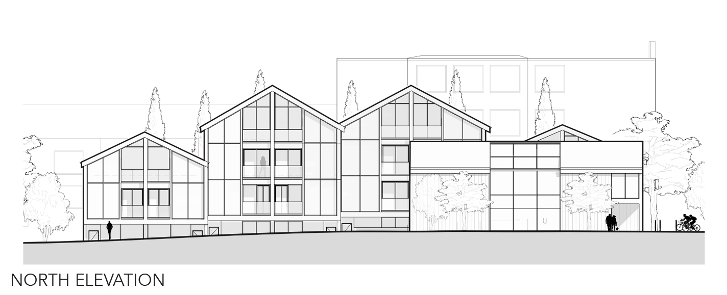 Located on 1 Madawaska Street , Green Garden Homes is a ten-unit townhouse complex. The townhouses have a staggered aggregation to address the sloping site conditions and maximize privacy for both interior and exterior dwelling spaces. The units are coupled in pairs, offering a variety of types that share the same architectural idea of verticality. The units’ orientation places the energy gardens on the south side, which maximizes daylight and permits passive heat gains in the home. Additionally, garden spaces are extended to the roof-top deck, which provides residents with an intimate outdoor space overlooking the park and York River. The Farmer’s Market, located on the corner of Madawaska Street and Alice Street, acts as a transition from Bancroft’s downtown core on Hastings Street and the residential zone on Alice Street. The Farmer’s Market opens up to the park, extending its activities to the outside during warmer seasons. The market promotes community building and gathering of townspeople, while giving visitors an opportunity to engage and support locally-grown fresh produce.