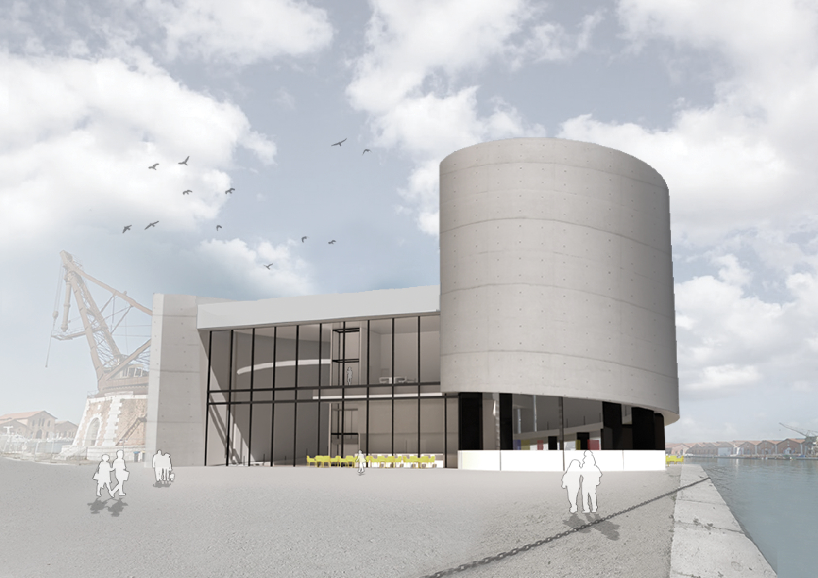 Located on the grounds of Arsenale di Venezia, Latona is a facility housing a storytelling room, café and offices. Latona’s concrete envelope is elevated by a glass facade, exposing the interior to the surrounding waters and offering a connection to the outdoors. Implementing the concept of infinity, the building spirals upward to a large skylight, allowing light to maneuver down. The light cannon unifies the programs, while nesting the special place of the building, which is the circular storytelling area. The people engaged in this space experience a visual connection between the skyline and waterline. The combination of glass facades and coloured panels in the storytelling room provide an interesting light effect, hence the name of the facility, meaning goddess of light. Latona strives to unify people through the art of storytelling, because nothing connects us better than a story.