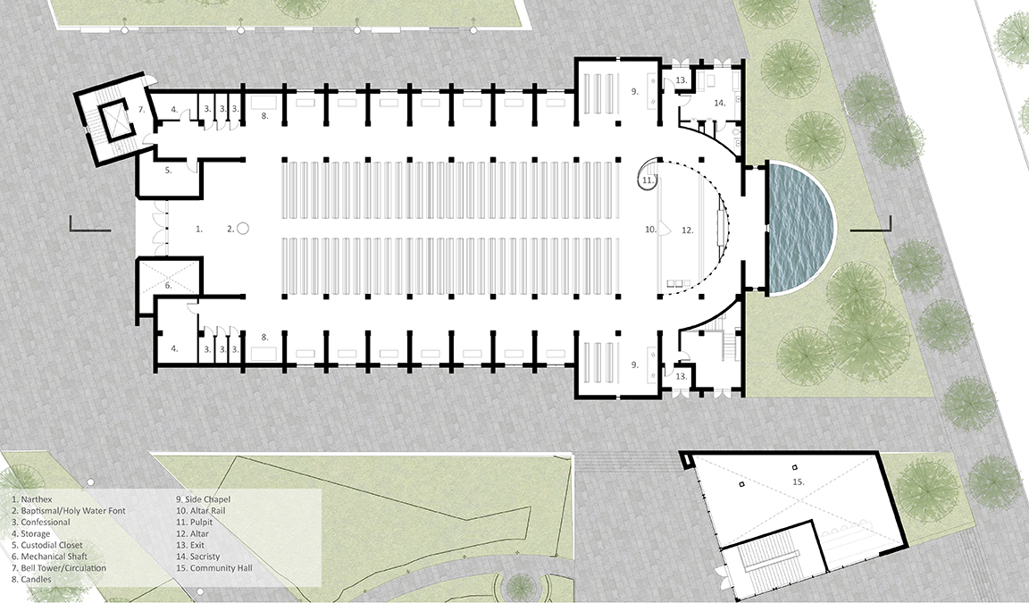 The massing is a heavier earth-bound form clad in stone encasing the lighter heaven-reaching form within it manifested through a Kalwall system application. The wooden truss structure reaches towards the heaven and rotates in ad quadratic proportions. The glazing casts shadows in Rhythmic patterns. The ever-shifting nature of the space provides a unique experience every time someone visits, whether its bright or dark, raining or snowing. This quality is what will compel users to visit again and again. The temporality of the atmosphere speaks to the transfiguration of Jesus, as witness by the apostles in order to give hope and strengthen the people’s faith in the religion.