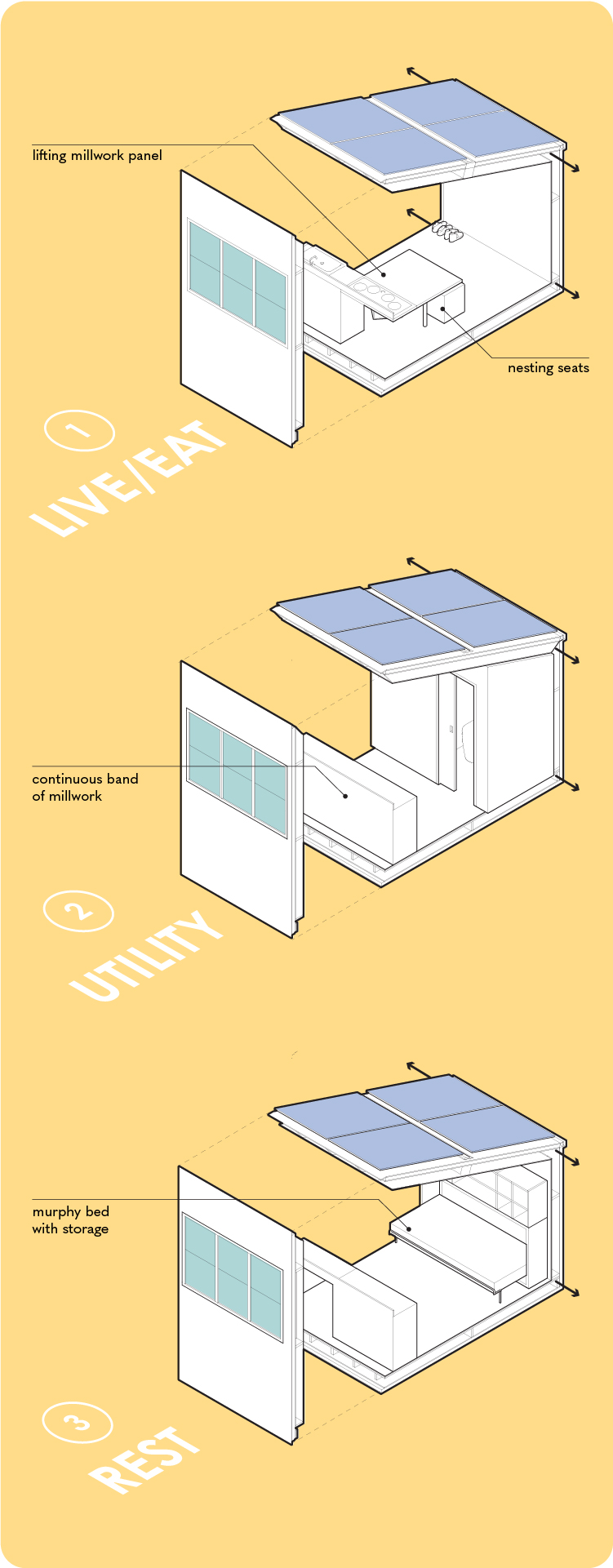 In a project of this scale, space is a luxury. Within the interior of the units, transformative furniture and millwork is used to encapsulate all daily needs of the occupant(s) within. In support of a modular and adaptable solution, a continuous band of millwork rests along the north wall, encompassing all storage needs and allows for panels to be lifted as desks. As exemplified, many components (beds, doors, etc.) can be slid, rotated, and transformed to maximize space.