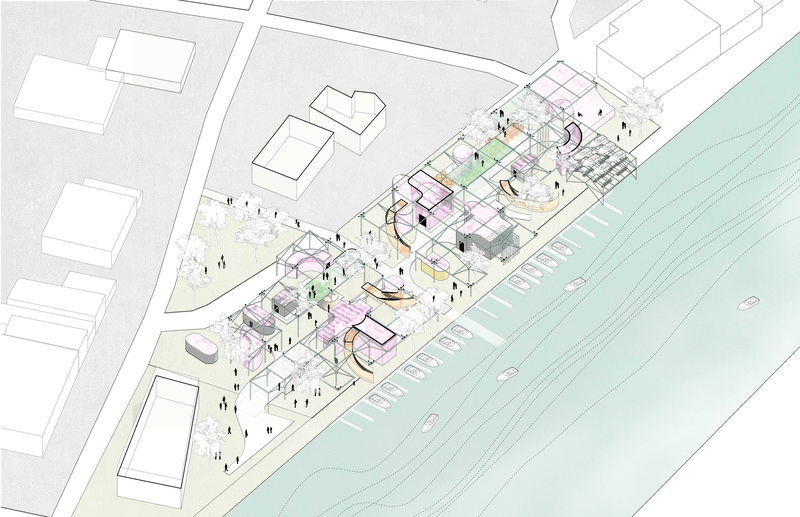 Allowing for a flexible market space in the center of a rural town encourages small businesses and local food growth. The steel structure allows for different sizes of market stalls to be erected for small businesses, local food producers, and make-shift makers spaces. The project is modular in its form, allowing for future growth and replication over the town for different needs and services. The playful nature of the project allows for the community to have agency over a multiplicity of small-scale interventions. The structure can host playgrounds, entertainment, music, and community activities. The project proposes a new typology for the rural community to connect through food and encourage the local boating industry.