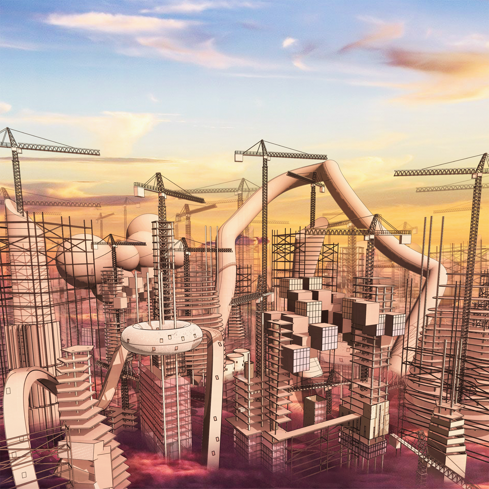 In a post-labour utopia, the opportunity to create architecture becomes universal. Advancements in technology also provide the means to design and construct anything the mind can possibly imagine. With this freedom, the line between reality and a sandbox game blurs – everyone is free to play in creative mode as the master architect of their own world. The individual who has always dreamed of becoming an architect can now live out their fantasies without restriction. However, in a future of abundance, the selfish individual designs as they see fit and ignorant architecture becomes the norm. Buildings latch onto another, others wrap around neighboring buildings and some continue to stack onto not yet completed structures. The question to be asked now is: when are people truly satisfied with seeing their designs come to life? The frenetic construction of the city appears to be never-ending as it continues to rise above the clouds.