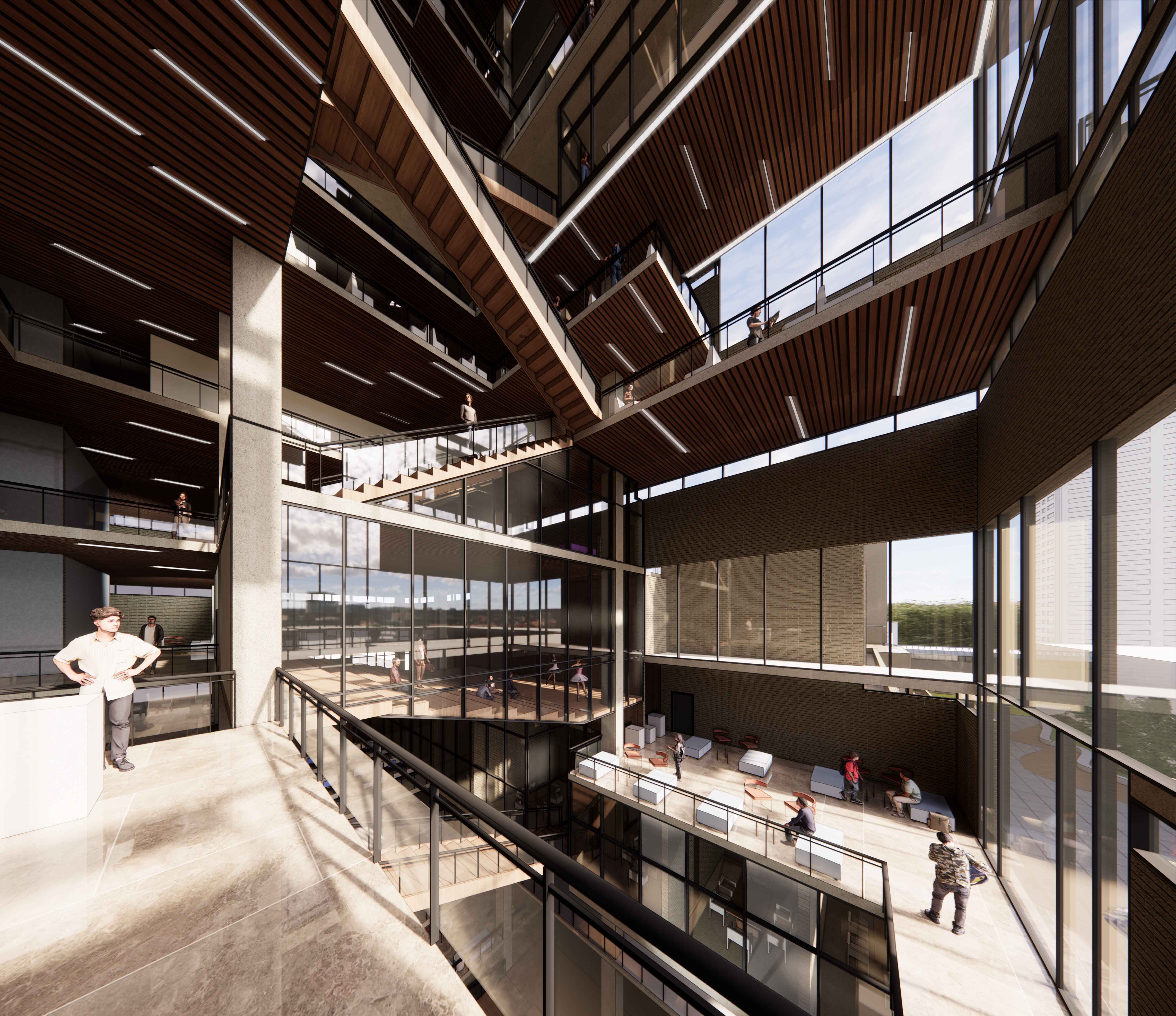 The design replaces the typical hard, stacked and consolidated floors of the existing library with a soft, collaborative core. By locating compartmentalized programs on the building’s outer perimeter to the south, the atrium acts as an extension of public activity. Driven by the notion of maintaining the existing auditorium on the lower ground floor, the design aims to guide public and student circulation linearly in plan to lead to the auditorium and activities on the lower ground floor. It extends the fluid circulation vertically by proposing a continuous atrium. The programs in the atrium are divided into six general clusters, starting with public collaborative programs on the first three storeys, followed by the second cluster containing similar programs but for students. The rest of the clusters are divided into Wellness Centre, Tech Support and Computer, Reference and Rare Books, and Materials Library. The program distribution divides the atrium into smaller communities, allowing for each department's autonomy, yet initiates spontaneous moments and idea exchange based on their proximity. The design aims to provide openness, interconnection, and maximization of the six main programs along the atrium. It achieves so by changing the opening area on each floor and proposing rooms that cantilever within the atrium. The visual connections and ease of orientation provided by these architectural moves allow for unique moments of learning, creating, and experimenting to blend with the atrium, despite the segregation of activities into distinct clusters for organizational purposes.