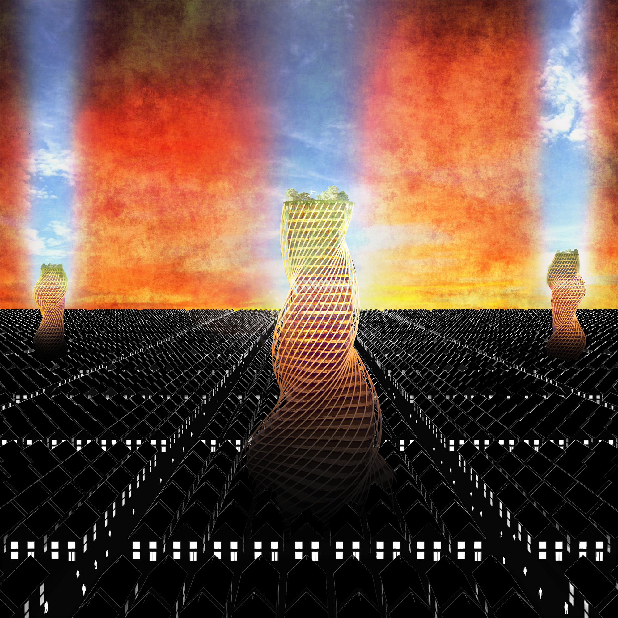 Rentism; abundance and hierarchy. The trade of scripts drives the economy. Personal devices create all material objects. Labour is not existent. The ownership of script intellectual property forms finan.cial hierarchy. An inevitable small figure of owners removes the middle class. Few have many, many have few. Office and commercial spaces are a rarity. Residential architecture is the primary form of architectural typology. Design complexity divides society through financial accessibility. Simplicity has no value. Poverty is the ownership of common goods. The impoverished own the same clothes, the same cars, the same house. All things artificial are greatest in abundance. Characteristics of a natural, non-material world are a rarity. Colour, light, animals and vegetation are luxuries. The clos.er to the sky, to the sun, the richer. The non-artificial world, the real world is the greatest desire.
