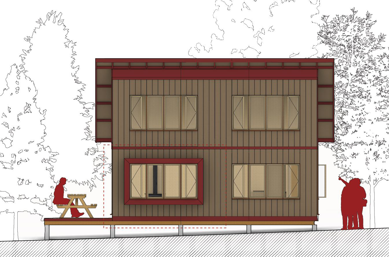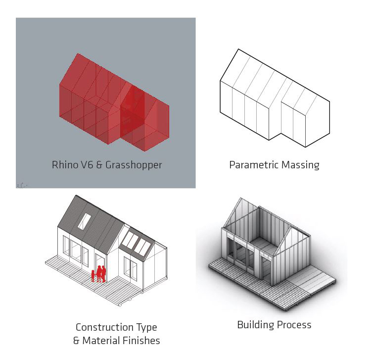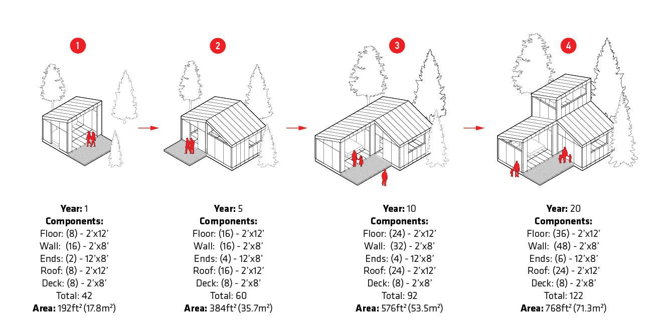 The New Wood Open Architecture Library is an open-source parametric modular construction system that allows dwellers to participate in the design, fabrication and building process. Rhino V6 and Grasshopper are used to digitally represent the modular components of the library. The components are parametrized to allow dwellers to more easily engage with the design process. Parameters; like wall height, opening size & location are flexible to a specific dweller’s context and needs. As dwelling needs change, the construction system is responsive and expands to facility more uses. This expansion can occur in either the X, Y & Z direction. The components from the previous dwelling are all reused in the construction of the next dwelling. Exterior deck space is used in every iteration as an area for simple future expansion as footings and foundations are already in place.