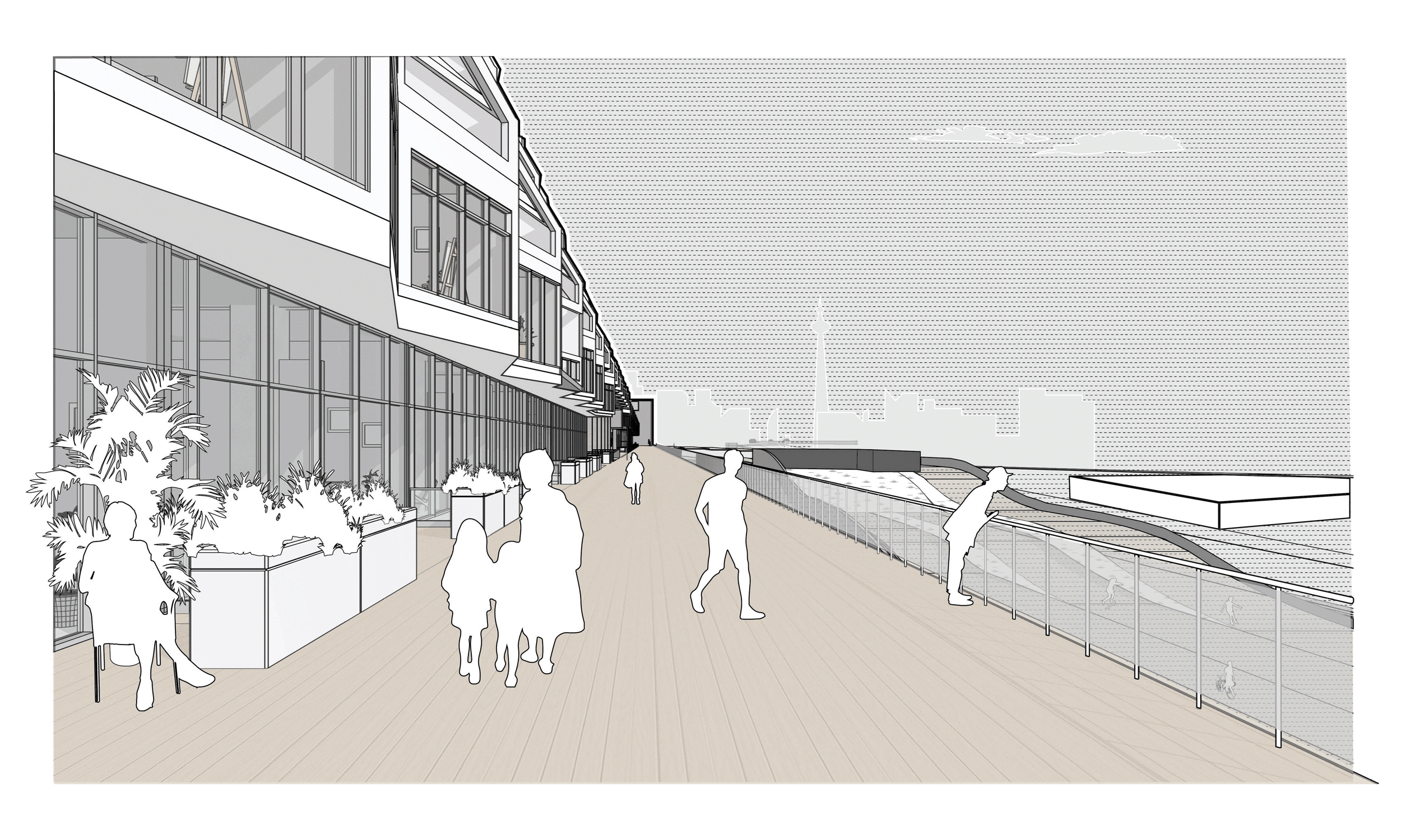 This is a view looking East towards the downtown, where we activate this elevated pedestrian walkway with Live / work units. Along this path, the public has access to these protected south views, and by accessing the ramps down one can cross the transit corridors to the south to the exhibition.