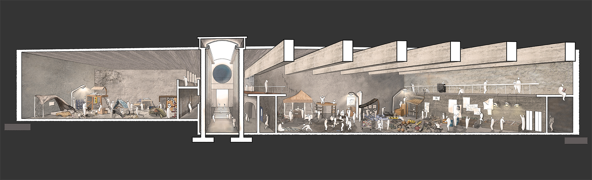 Up above a city crumbles as an AI entity takes over what was once a prosperous and abundant land. You could do one of two things, either worship the entity, or survive without it. The thick concrete walls surround the NULL community, hiding and protecting them from the dystopian atmosphere continuously growing above them. The once cold structure is now warmed by the overpopulated number of bodies, filling the air with the smell of sweat and debris. Everyday life consists of finding, trading, and creating things out of scarps – anything to elevate anyone’s chance of survival. Although dark and scarce, this newborn society of equals flourish as relationships between one another continue to develop. Children playing on a plywood structure, a man trading a chair for someone else’s wisdom, equipment artifacts taken apart and built into something new - all capture the selflessness of the NULL community.