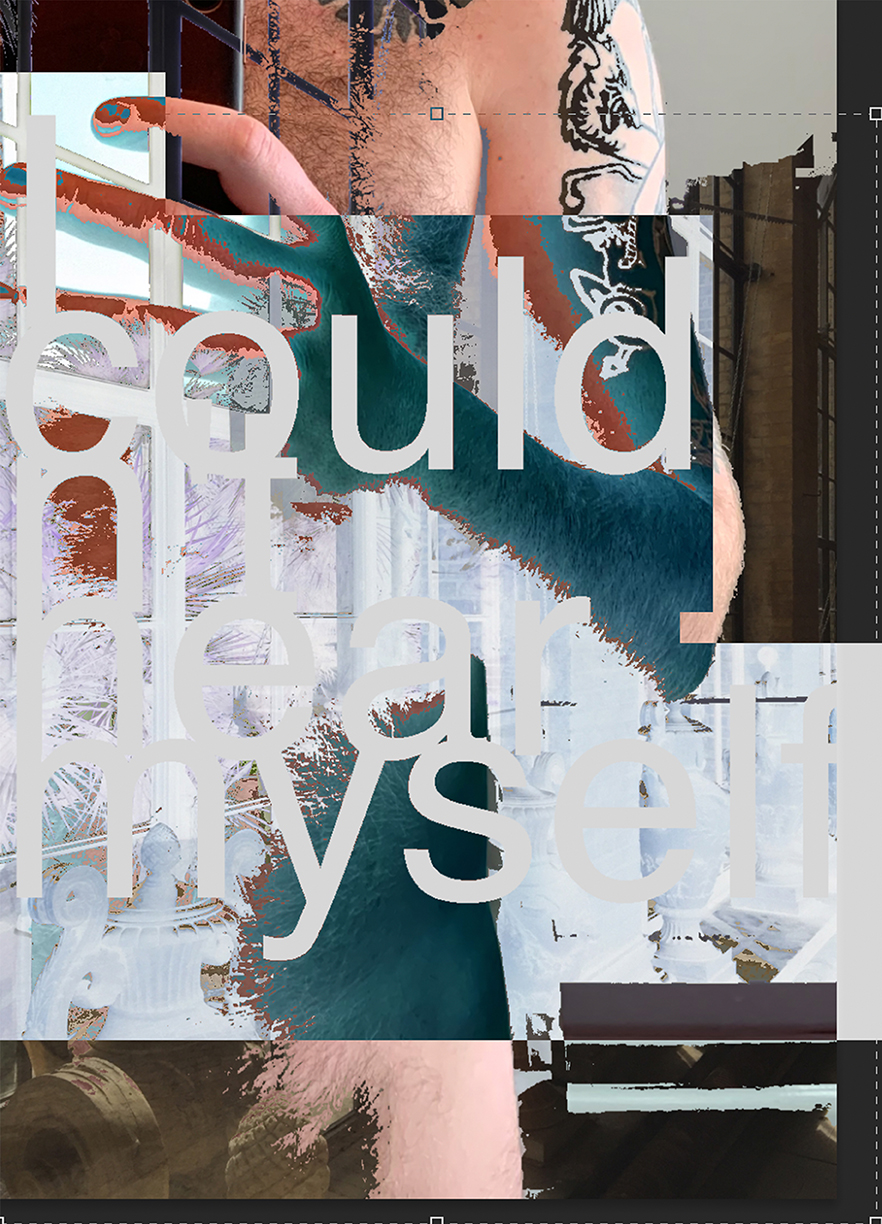 The images explore the oscillation between the objectification of the queer body and the anthropomorphizing of environments. In this oscillation, the viewer is brought into the liminal space between the seen and unseen: between the body and space. As the eye moves away from the centre, the images show a new form of understanding, with the absence of a focal point. The text—pulled from a personal stream of consciousness—blends with the other layers to create something entirely new. By manipulating a fragmented gaze, the work is driven by a misuse of space and image; deconstructing the viewer’s hierarchies of understanding. Paired with digital interference, the series presents the idea that there are no new ways of representing just recontextualizing.