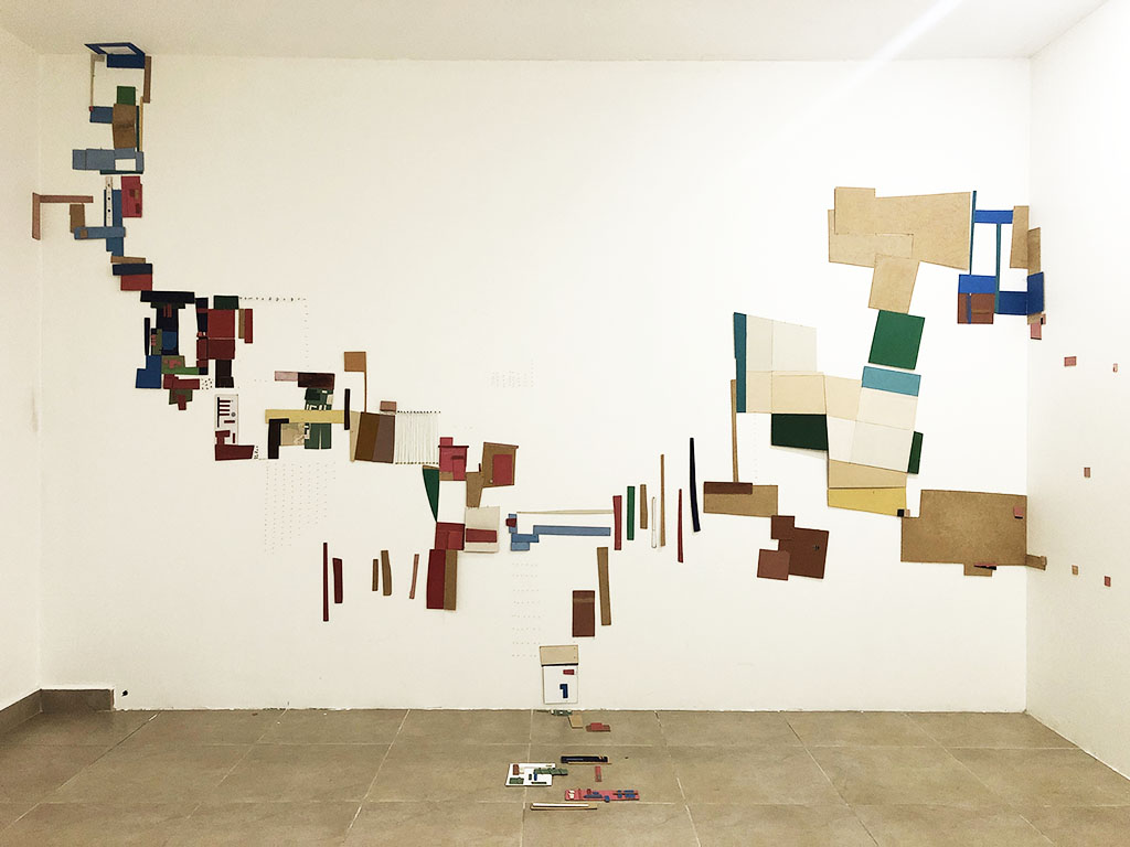 spaces B E T W E E N, Gallery Wall Installation: Masonite, gouache, staples, wire, screws, brad points, eye-hole screws, washers, nails, 12’L x 13’H x 18’D, 2020, ECUAD, Vancouver, BC