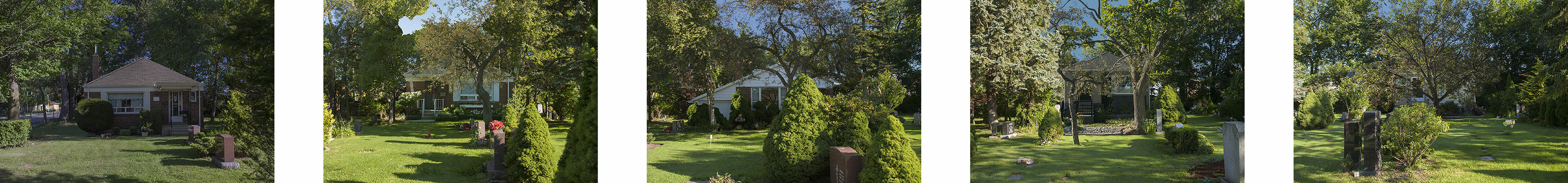 ParkHome is a photographic installation of neighbourhood architecture, a representation of evolving tastes and an expression of shifting cultural capital. A street composition of 55 homes along Park Home Avenue in North York (north Toronto) combines the diverse front façades as viewed from the street with a backyard view of their collective landscape taken from the perspective of the adjoining cemetery. I set out to reflect the diversity of settlers, represented by their domestic architecture. The absence of humans in these photographs avoids documentary as an endpoint. Yet the people who occupy this streetscape and those buried in their backyards are present through headstone names as well as the aesthetic flourishes made by the homes' inhabitants. The headstones have been photo-collaged in with the front lawns of this streetscape, thereby removing driveways in favour for more idyllic landscapes that are backgrounded by Neo-eclectic monster homes alongside post-war CMHC bungalows. Generations thusly mix. It is impossible to see neither life or ghosts when viewing the source images independently. But when they are superimposed as a photo-collage, we enable our imaginative eye to see into fluctuating and impermanent worlds that surround us every day. The composites suggest a narrative that disrupts the idea of the colonial “heritage home.” When seen together, these images fold inward and upon ourselves as futile exercises of contemporary home-life in an urban reality aptly reflected a mere block away on Yonge Street, that is hinged on increasing density through a vertical axis of up and down, above ground and underground multi level skyscrapers.