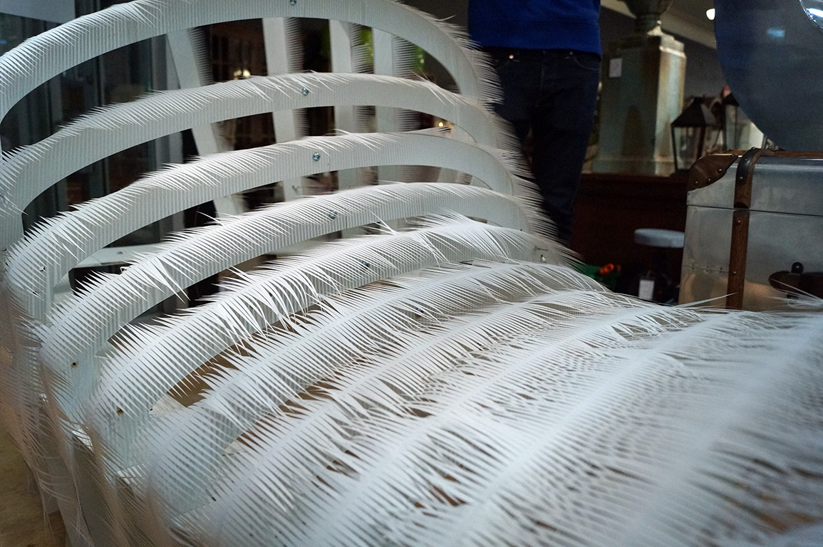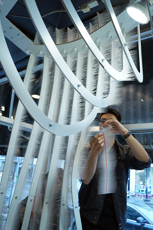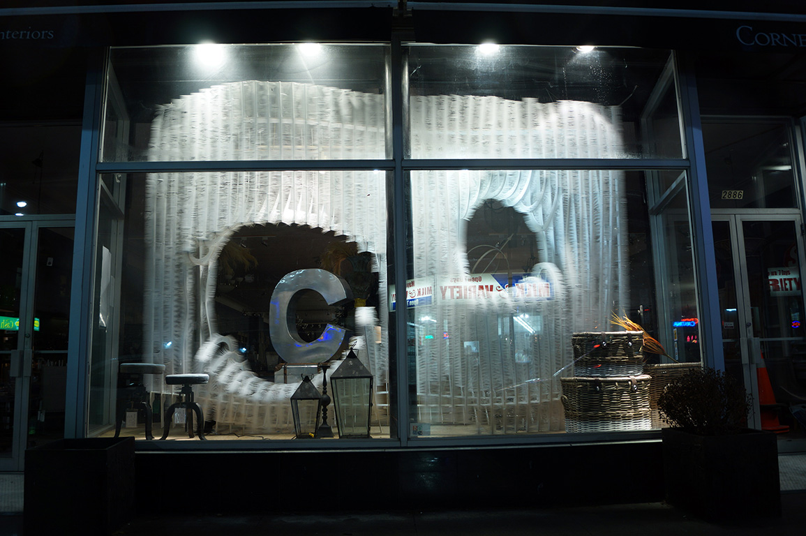 Photokeratitis acts to simultaneously serve as a backdrop for the displays of furniture as well as a display on its own. Using a MDF skeleton structure with paper fins clad on top, the flickering movement of paper fins creates an impression of a living wall, drawing the attention of pedestrians into the storefront as well as the featured furniture.