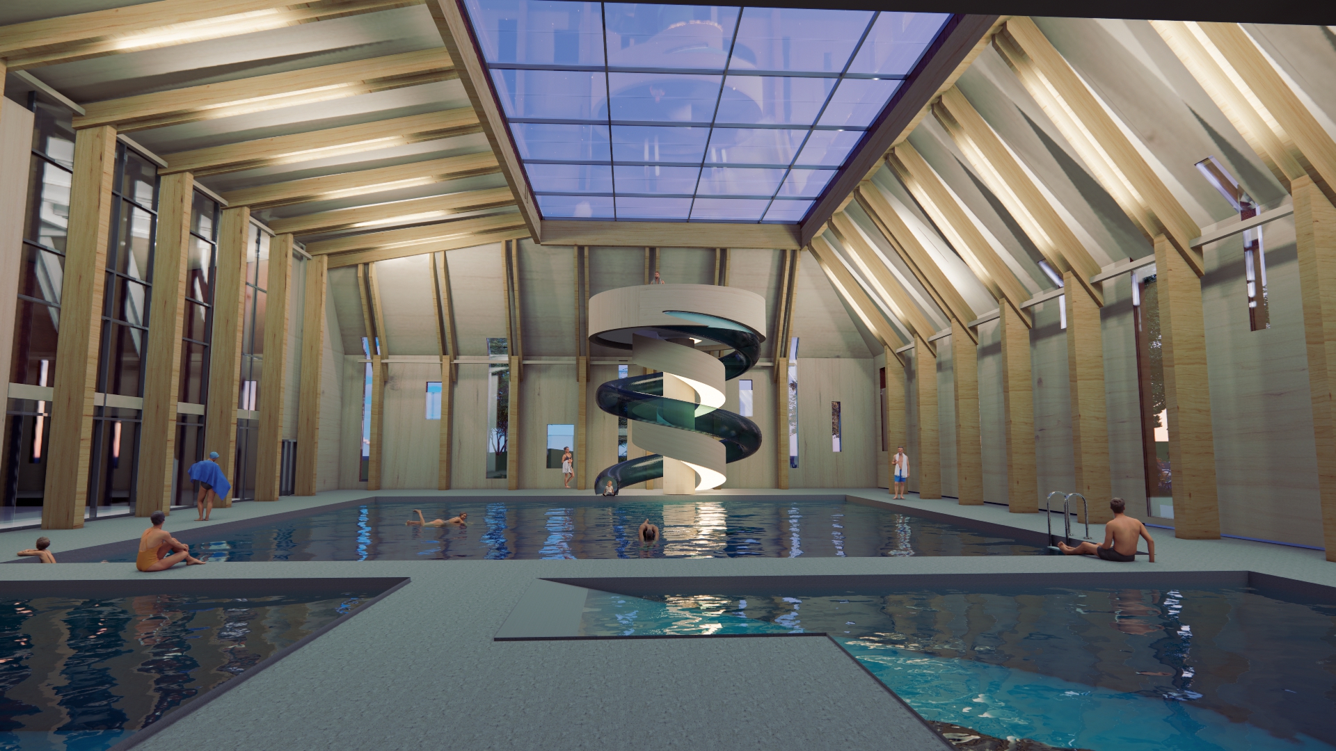 The first mass houses an athlete pool, catering to the training and competitive needs of swimmers. The second mass boasts a leisure pool, providing a space for families and individuals to relax and enjoy aquatic activities. The third mass is designated for dry fitness, offering a diverse range of exercise options. Each of these sections is not isolated but visually connected, reinforcing the idea of community and shared activity.