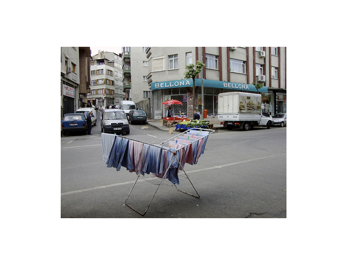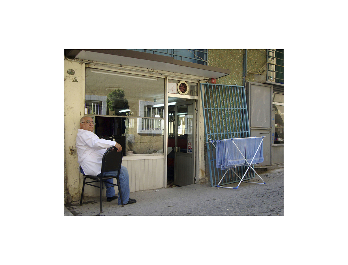 The street, the people, the mundane these form the image of place. My neighborhood of Karaköy in Istanbul. By erasing the iconic architecture of the city, the image of place is revealed through the intersection of life and the street. Universal Color, is a photographic project that began as an exploration of the everydayness of the locale. The accidental discovery of the towel as the signifier of place evolved into an ongoing mapping and documenting of the ubiquitous towel. Their similarity of the solid block color announced the local barber shop. The towels—faded sheets of universal color laid street by street drying in the sun formed the points on the map. The distinction of place staged by the juxtaposing elements which by chance accompanied the racks of towels; the chair, the fruit stand., the people. The architecture dissolves, becoming unintrusive. Allowing the exterior to shape the city, the street no longer exists peripherally.