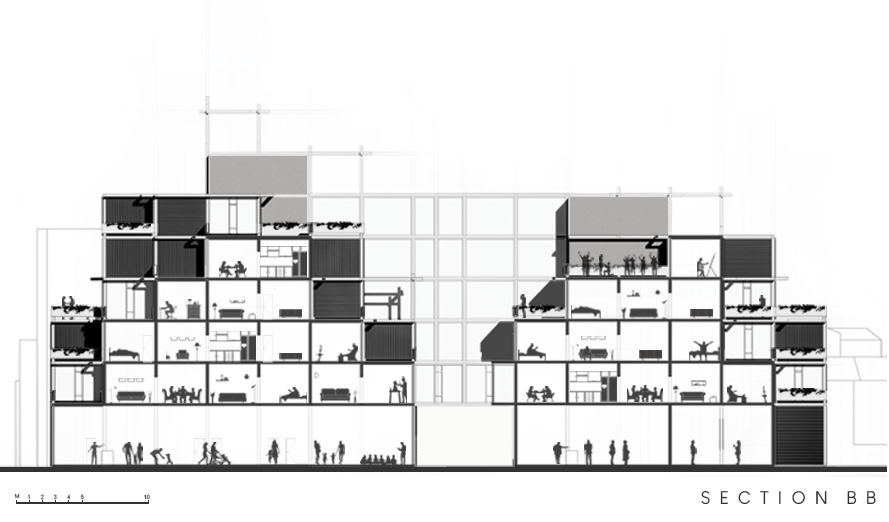 The unit plans demonstrate a narrative of a family throughout their lives and illustrates how the spaces can be changed, allowing for the architecture to grow alongside its inhabitants.