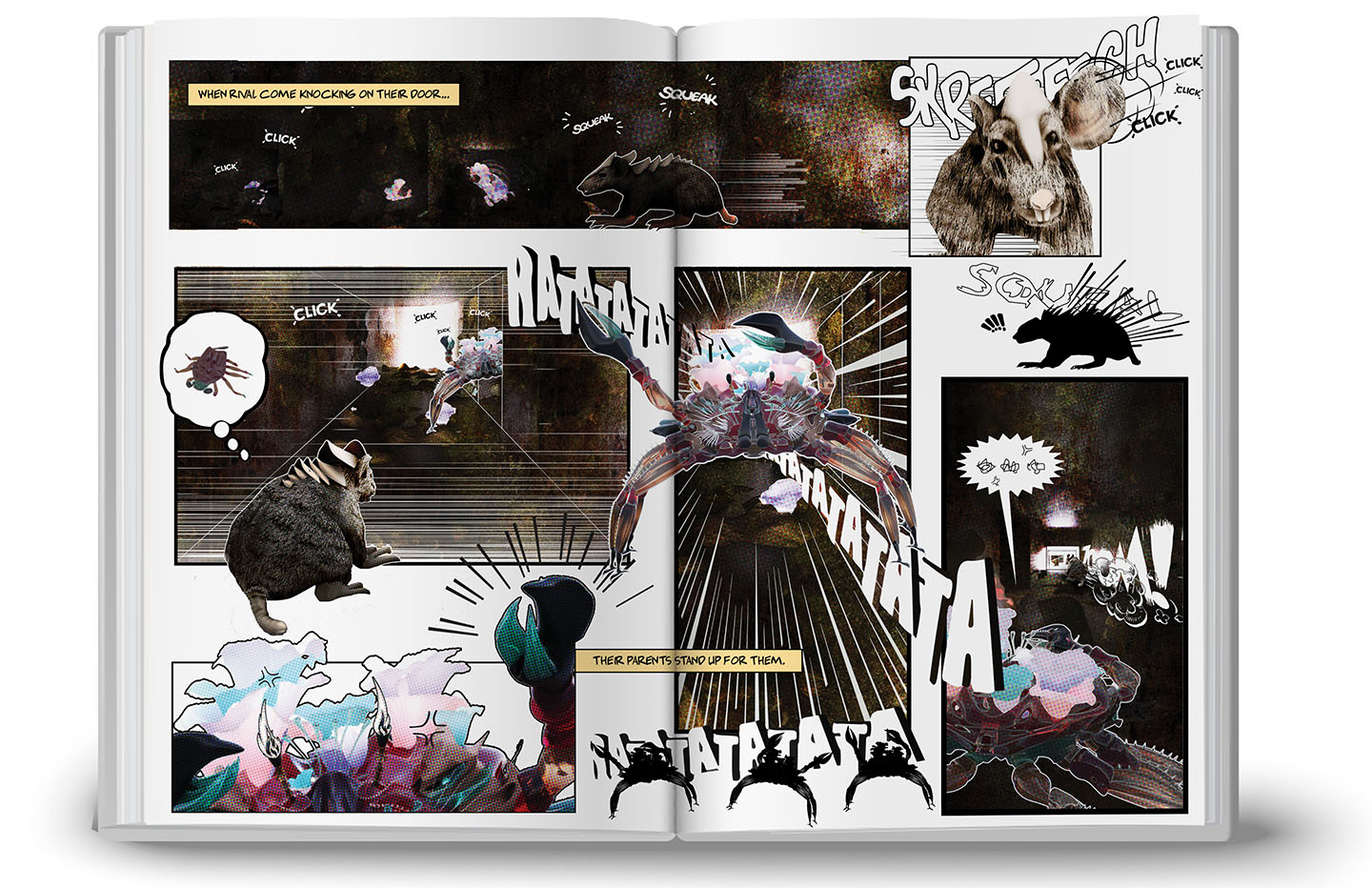 The Ornata Cancer Ardentem, or the Duct Crab for short, is a preyed upon duct-dwelling crab species in the Post-Anthropocene. Emerging from the ductwork of the overgrown city of San Francisco, this crab species is a delicious treat for many. As a terrestrial creature, the crab inhabits confined and dark spaces within the overgrown built environment of which, duct systems and pipes are its ideal choice. The Duct crab species evolved from the blue crab, as they began to develop unique characteristics, such as more agile pincers and rust coloring to aid with camouflage. Due to the abundance of fungus, the cause of the human’s mass exodus centuries before, the crab begins to develop a symbiotic relation with one particular species – the Glowing Duct Fungus. This fungus has a lack of chitin, which is very abundant in the crabs’ shell, so it begins to inhabit the backs of the crabs. Upon molting, a fungal build-up emerges in the crab’s nest, which then is able to serve as the crab’s food. The more the crab molts and grows, the more fungus they generate for consumption. Where previously, ducts served as a means to transport air and wasted real estate, the Duct Crabs are able to capitalize on the opportunities and protection these spaces offer. They collect various pieces or garbage and tree bark to compose their nest, which serve as their home base where they are hiding, mating, and molting. The crab’s survival is perilous. Out of the thousands of eggs laid, only a handful of the crabs survive into adulthood. However, their numbers still grow, and they are able to continue to thrive in their dark, damp and safe duct nests.