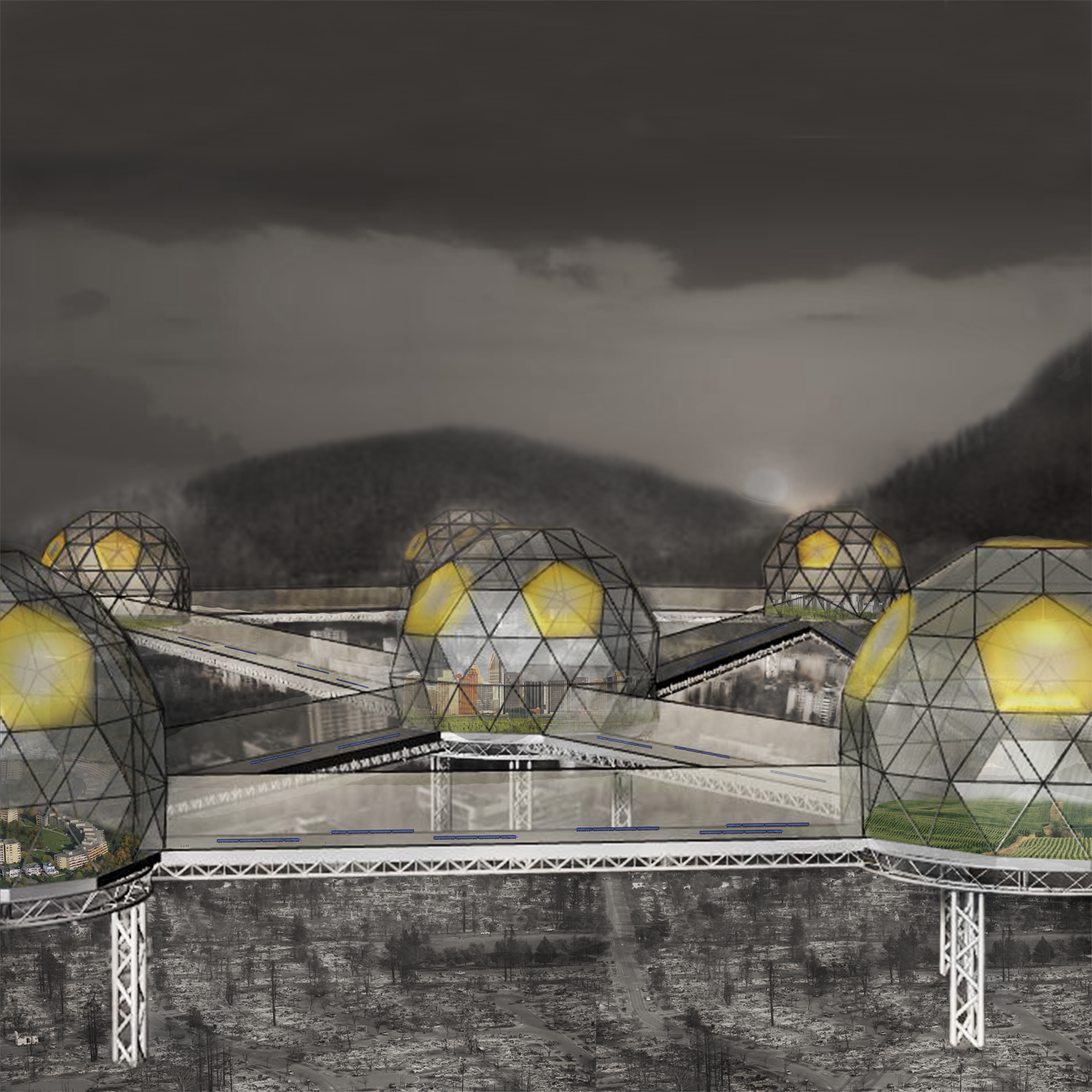 Scarcity has become a matter of life and death. From unstoppable forest fires to toxic air quality, plants and animals can no longer survive in the natural outdoors. However, in this world of socialism, new livable cities have been built above the abandoned old ones. These cities are made up of 6 interconnected structures that can produce artificial solar energy, and maintain necessary oxygen levels. Each structure is dedicated to a different component of society with the appropriate energy and climate control needed. These components include agriculture, manufacturing, residential, business/culture, civil, and academic. People can travel between each of them either by personal manual bicycles or electric powered public transit vehicles. These self-sustaining complexes exist all over the globe, each with a maximum population of 30,000 people. In this seemingly unlivable world, humanity is still able to find a way to survive together in a localized, and highly controlled environment.