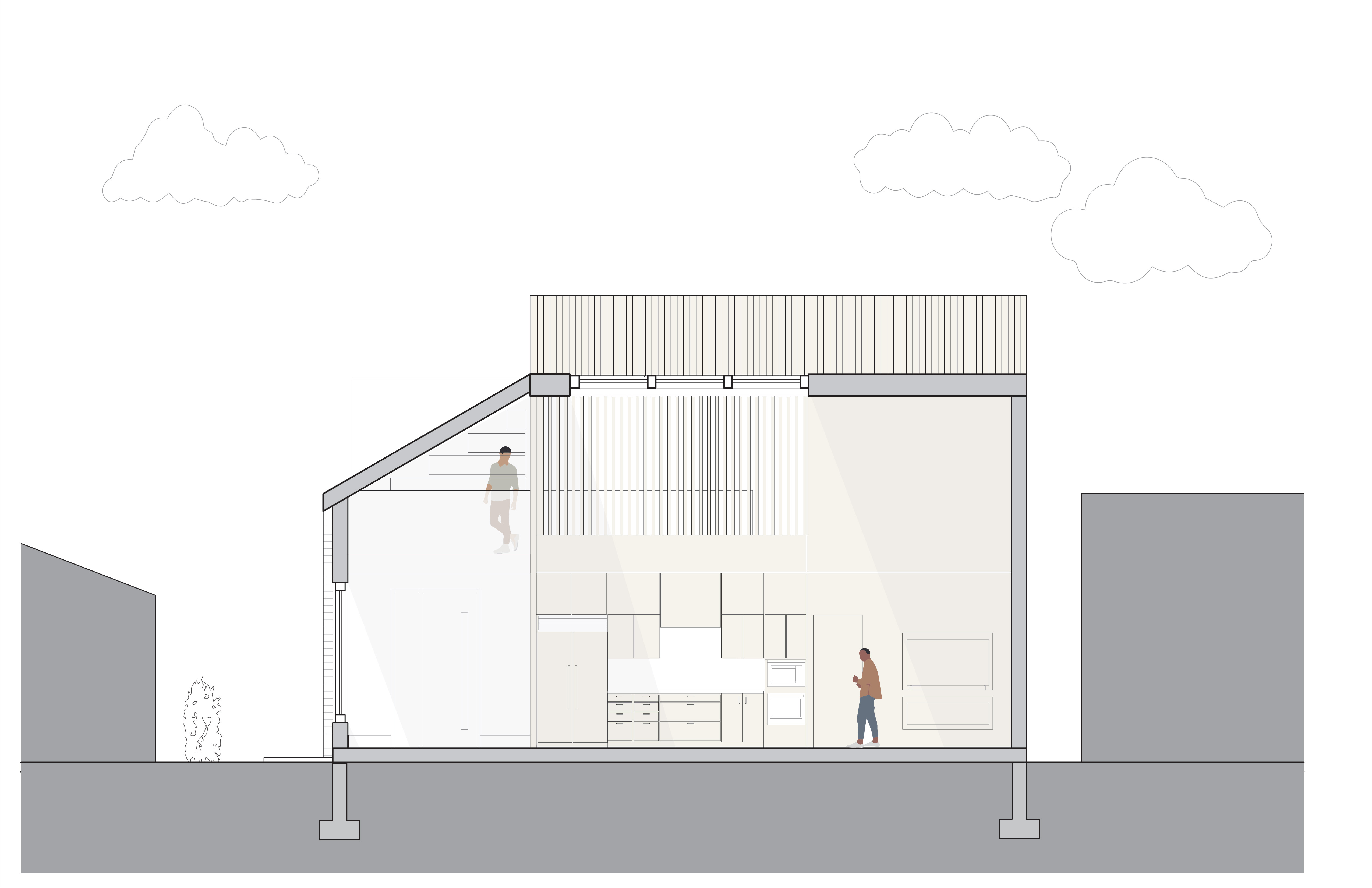The laneway suite design located in the Bloor West neighborhood of Toronto establishes a transition in densification between single family homes and apartment living. The gentle density project allows for 2 variations of living within the design. A 2 bedroom family home and a single bedroom apartment merge in forms. The up-reaching wooden form transforms through the interior and exterior containing the major programmatic elements, allowing for a free flowing plan that is translated through a lighter space that surrounds and interacts with the wooden form. Ultimately, this infill project pushes the boundaries of residential living in the suburbs of Toronto, and acts as an example for the future of gentle density moving forward by activating laneways.