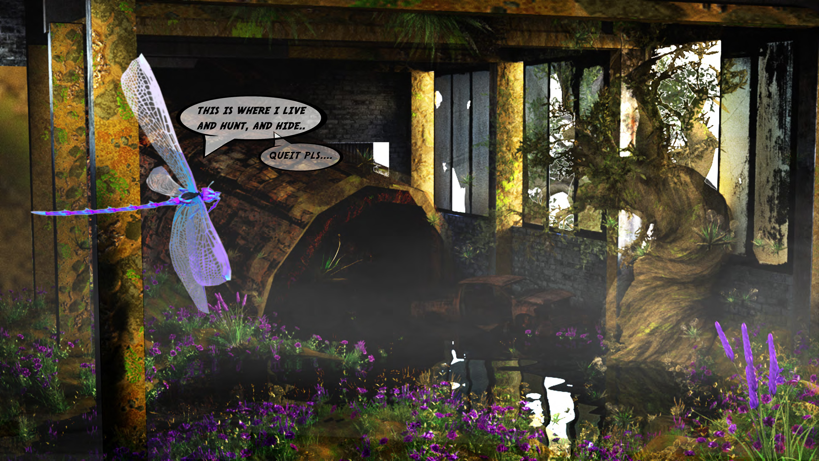 Despite the nice and livable environment protected by the cavernous zone, we are still being hunted when we were living underwater in our larvae phase of life. Many of us died as a snack for fish and turtles. I survived, but it wasn’t easy. Summer was always nice, but once the temperature drops, the cordyceps (aka the zombie fungus), would release their spores in the air, attacking the dragonflies' neuro system. They are the ultimate predator for us dragonflies. We are raised as fighters, but the cordyceps can take us down without a fight. Luckily, they only live in the darkest spot in the building ruins. So beware of the darkness!