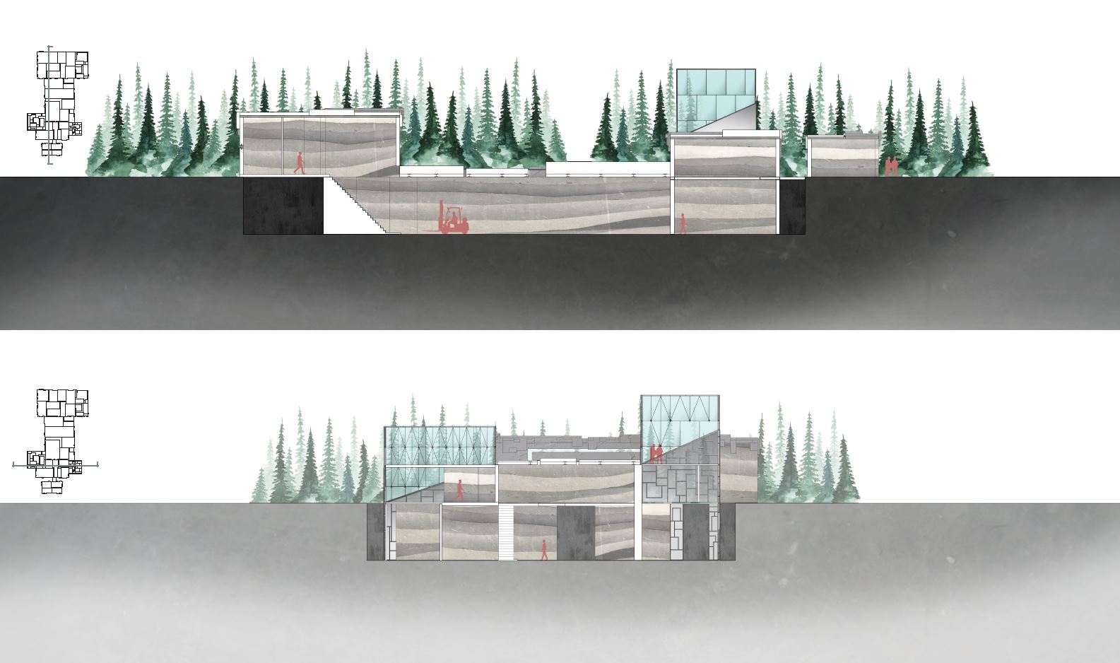 The inspiration of this design for the winery came from the analysis of the tectonics and geology of the site. Upon visiting the site, I discovered that there are some unevenly distributed cracks throughout the gleysolic soil. The soil is the foundation for producing flavorful grape that can later be processed into wines, hence the design intent played off from the patterning of the soil. I lowered the building into the earth, to have the roof at ground level with the earth. The roof will share the same formation of cracks as the soil, and some of the cracks are designed to be windows that will allow lights into the building. There are two towers of my winery that will peak out from the ground, just like the vines. Their exterior cladding compose majorly of polycarbonate at the bottom and transparent glass on top. This design shares the idea of grafting of the European grape vines with the North American grape vines. It is a combination of two identical materials to produce something better.